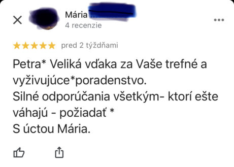 Makala som pre svojich klientov v posledných mesiacoch toľko, že som si v mnohých prípadoch nevypýtala recenziu na moju prácu. Mám ich len pár písomných, za ktoré som tiež rada, ale s videorecenziami sa nedajú porovnať. Dnes ma to mrzí. Pýtam si ich dodatočne, uvidíme...