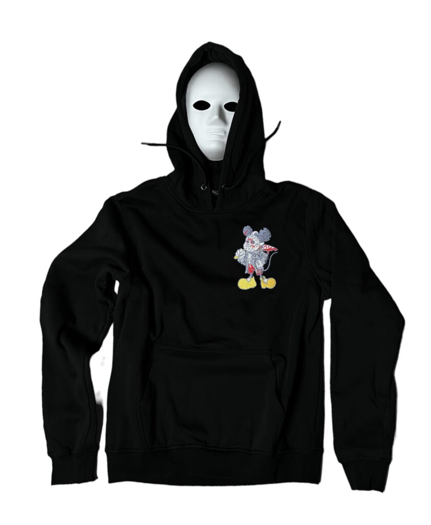 Pánska mikina s malou výšivkou Mickey Mousa zabijaka. Rozmer výšivky 60 x 100 mm (š x v). Klasický ležérny strih mikiny s kapucňou so šnúrkami a klokankou. Materiál: 65% bavlna, 35% polyester, fleece, 250 g/m2